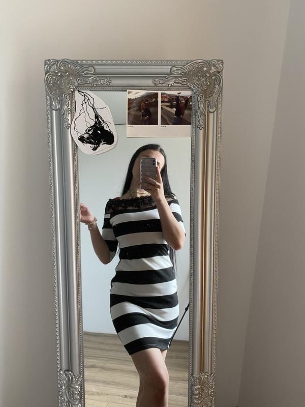 Платье в полоску, размере S, может быть на XS. Из качественной ткани, не просвечивает, имеет укороченный рукав и черное кружево сверху на вырезе. Состояние идеальное, без дефектов