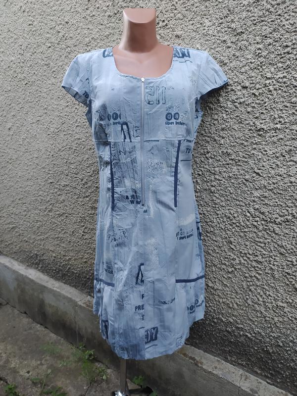 Платье застегивается спереди на молнию. Ткань напоминает домик, хорошо держит форму. Материал: 70% полиэстер, 20% вискоза, 10% хлопок. Указан размер L. Замеры: ширина в плечах 42см, пог 50см, пот 45см, пост 50см, длина 90см.