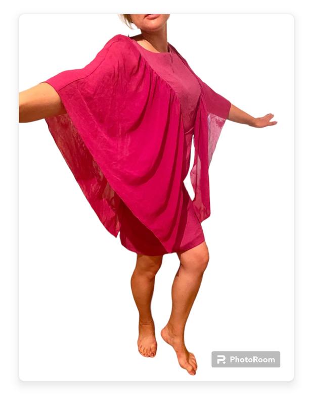 платье короткое, ткань комбинированная, приталенная, рукав типа летучая мышь, состояние очень красивое плечи 32 талия 34 пог- 46 длина 90