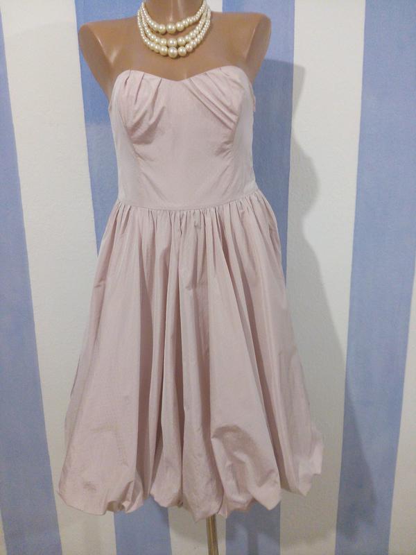 Ніжно-рожевого,пудрового кольору,основна тканина спідниці пришита до підюбника,є петлі для бретель,можна купити нарядні бретелі і носити з ними,збоку замочок,на підкладці.Пог-45-47, пот-38-40, бедра вільні,довжина88-90, корсет-24-25( від грудей до талії), спідниця-63-64, на таліі є тонесенькі шльовочки для ремінця.розмір М-Л,вказано 12.Одягнуто на манекен з параметрами 90-73-91 (є ще трохи місця).Плаття ну дуууже гарне,якщо підібрати гарне взуття та аксесуари - будете королевою балу,підійде і на випускний.