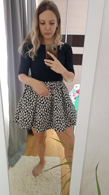 Красивое платье черно-белого цвета, низ принтован мелкими цветами! Платье требует замены замочки, есть затяжки.
