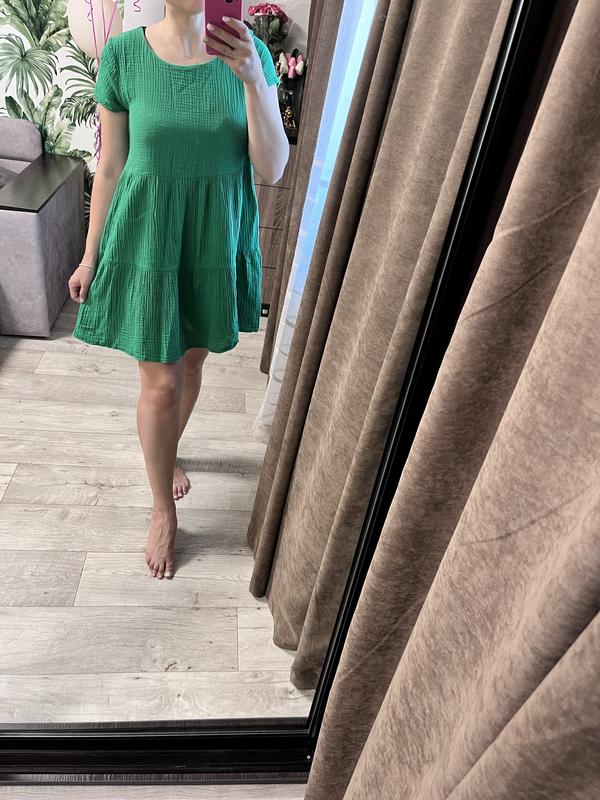 Гарне платтячко з натуральної жатої тканини - муслін. Красивий насичений зелений колір! Є кишені. На груди - до 97 см, на талію до - 85 см (вільно), бедра - вільно. Заміри: ПОГ- 48 см ПОТ - 50 см (вільно) Стегна - вільно Довжина (від плеча) - 83 см Тканина - трошки тягнеться