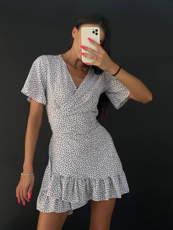 💕РЕАЛ ФОТО💕 В наличии в количестве🔝 🔺Сукня модель 2308 тканина : софт принт цвет: черный, белый размер: 42-46 (one size) Легкое невесомое платье на запах в мелкий горошек💕 Идеально садится на любую фигуру. Качество👍🏻 Параметры: ОГ: 85-95 см
