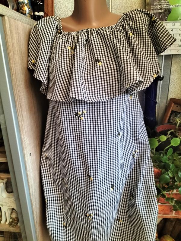 короткое платье,верх украшен баской, принт клетка+ вышивка цветы, крой прямой, пог 46 поб50 длина 76