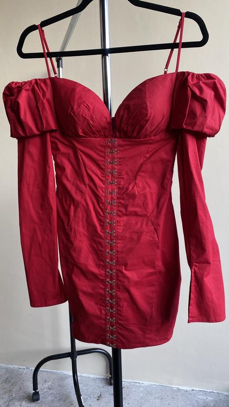 Платье красного цвета, очень красивое пошиву с интересными рукавами.