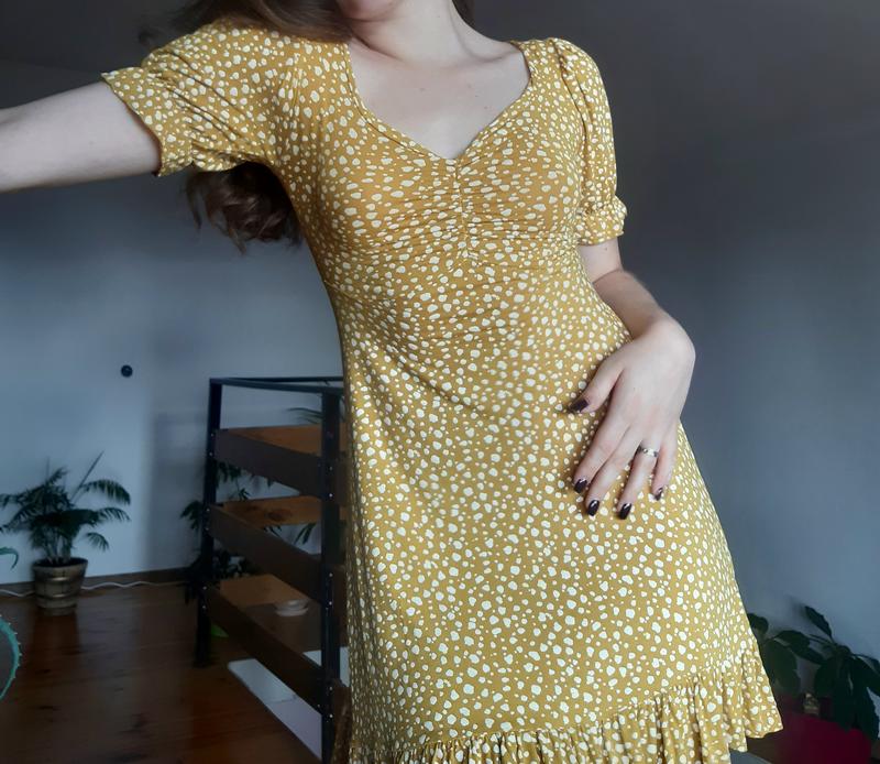 плаття гірчичного кольору із білими цятками та гарним вирізом на спині. бренду boohoo, розміру S.