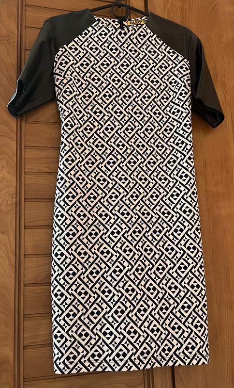 Облегающее платье с кожаным коротким рукавчиком в размере s, но подойдет на М, красиво тянется, в идеальном состоянии, ткань очень приятная к телу, по длине 85 см