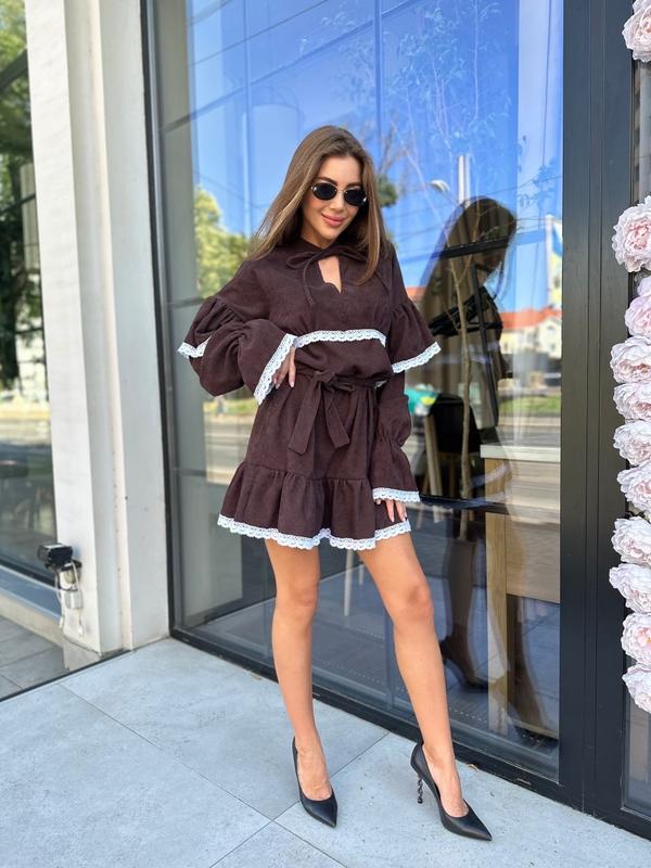 😍Топова сукня Арт: 6006 🛍Цена: 690 грн 📏Размер: 42-44 44-46 46-48 48-50 ☝️Описание: платье свободного кроя под пояс с воланами и кружевом, воротничок стойка на завязке 🪡 Ткань: микро вельвет + кружево