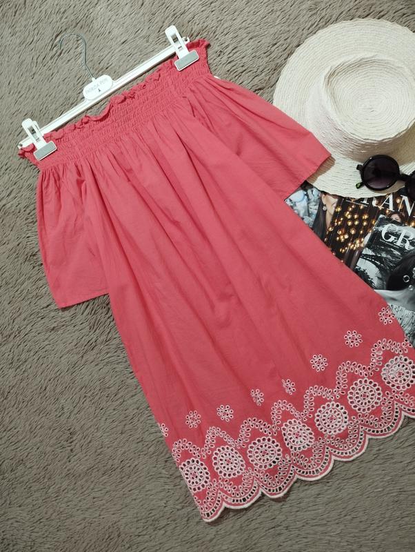 В идеальном состоянии. Красивое платье вышивкой и открытыми плечами. Тканина легка, бавовна, не тягнеться. Размер на наборе 12/40/L но смотрите по замерам Замеры (полуобхват): Груди 55 Талия 59 Стегна 62 Длина 68