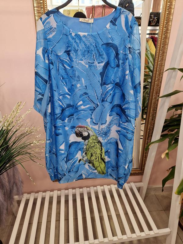 Сукня в розмірі ХЛ Дуже красивого небесно-блакитного кольору Спереду на папугу стрази плечі 40 см, в грудях 54 см, рукав 3/4, довжина 90 см