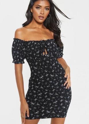 Красивое мини платье на лето от pretty little thing В мелкий цветочек, с завязкой на груди По бирке размер М, по факту будет на С и рост 150-155 см На фото параметры 93-70-98 рост 160 см Ткань в рубчик, тянется Состав: 95% полиэстер 5% эластан Состояние идеал 5/5