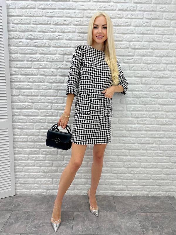 🌟Повседневное платье с принтом гусина лапка "Rosemary"🌟 АРТ: 8561 Материал: Твид 📏 Замеры: Длина от плеча: 88-93 см Длина рукава: 44-47 см 🪡 Размеры: 42-44, 46--48, 50-52 🎨 Цвета: черный, бежевый _________________ Цена 680 грн F&G