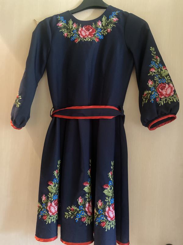 Темно синее платье с вышивкой цветов