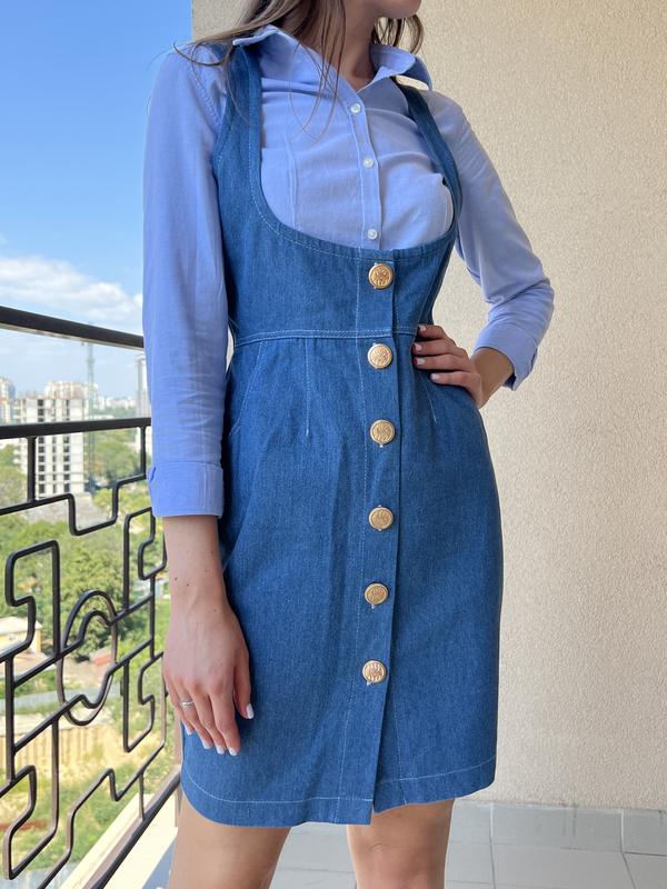 Джинсовое платье с золотыми пуговицами, при стирке не меняют цвет! Носить можно как под рубашку, так и под футболку, с каблуками или кедами! Универсальное платье! Размер S