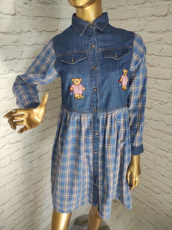Очень милое! Облегченный деним + хлопок, патчи мишек. На невысокий рост. Длина 88 см. От плеча до талии 36-37 см. Плечи 35-36 см. ПОГ 42 см. Талия 40 см. Бедра свободно. Рукав 53 см.