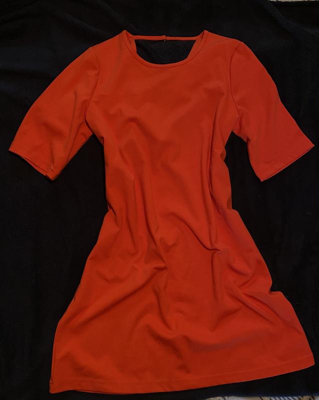 Платье ярко красного цвета, с интересной спинкой, мой рост 165 см, платье по колено. Прямого кроя.