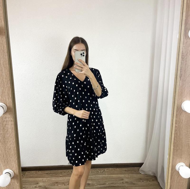 Стильна літня сукня в горох з об’ємними рукавами Довжина п-89, з-91 ПОГ 46-47 ПОТ 44 ПОБ 63 Розмір 10 Склад 100% віскози