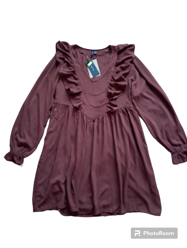 Платье, которое приталенное, с рюшами, спереди украшена ажурным жгутом, очень легкое.Бренд Vero ModaПлечи-38см,грудь-50см,талия-48см,длина-85см,рукав-66см.