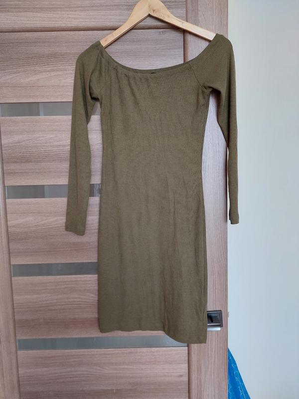 Красивое приталенное платье в рубчик с открытыми плечами. Тонкая ткань, тянется, не просвечивается. Цвет хаки, очень красиво подчеркивает фигуру.