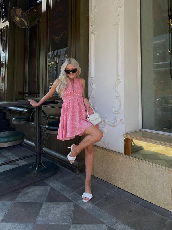 Фото ВЖИВУ Коктейльні сукні 💓 ▪️Модель - 282(sh) ▪️Тканина -софт ▪️Колір - принт білий, принт рожевий горошок ▪️Розмір - 42-44 та 44-46