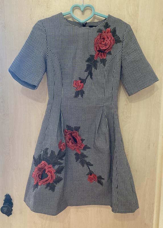 Сукня в клітинку з декором обʼємні квіти. Розмір XS(34), сукня ідеально сідає на S(36). Тканина цупка, добре тримає форму. Стан ідеальний. (Вдягала два рази)