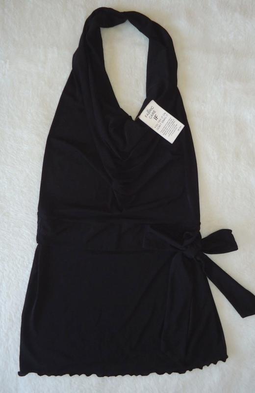 нове, воріт спадає красиво хомутом. плечі голі, але приховують лінію бюстгалтера. на поясі красиво зав'язується, йде з-м