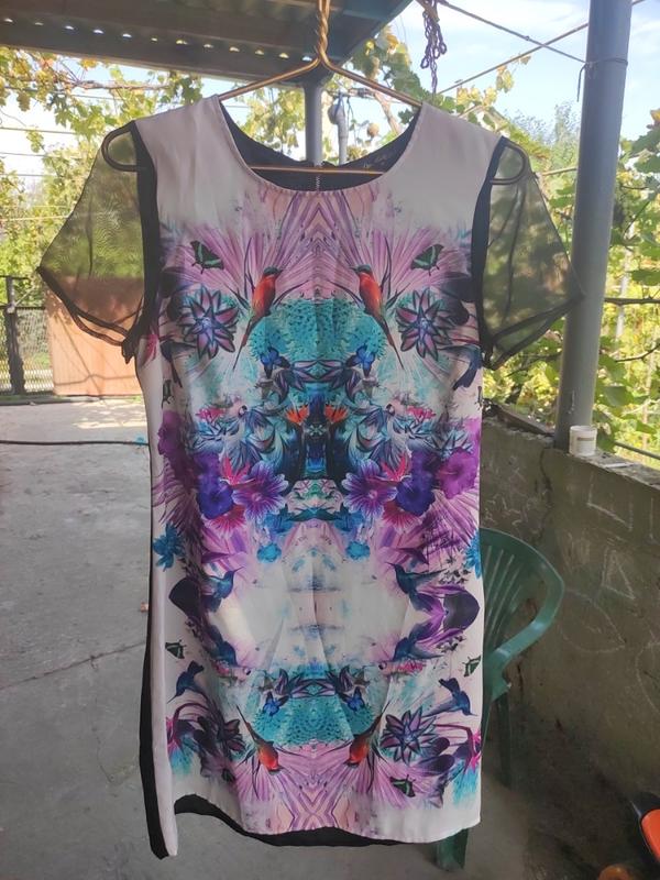 очень яркое платье, легкое, внутри есть подкладка черного цвета. рукава сеточка. ПОГ 45 см. ПОТ 44.5 ПОБ 52 см. длина по спине 87 см