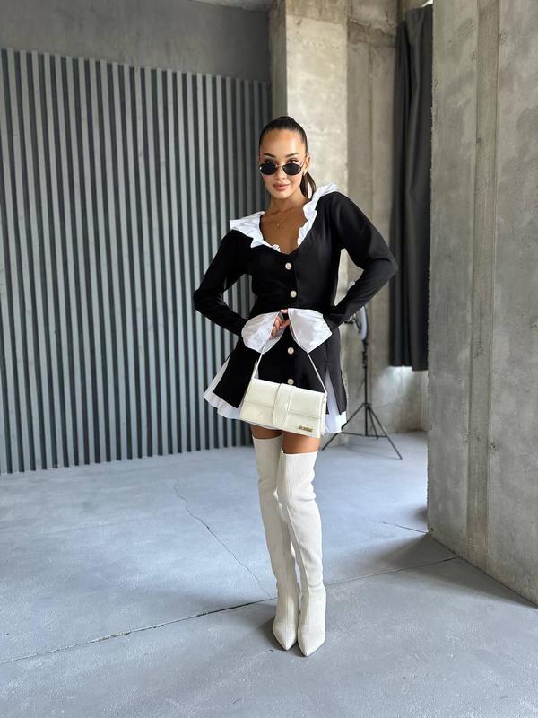 Оригинальное мини-платье ❤️ Которая не оставят равнодушным никого 💥 Можно носить с высокими ботфордами или просто каблуками🥰 Платье имеет имитированную юбку,манжеты и воротник💥 Красиво садится по фигуре и подчеркивает талию 😍 Фото реал 🤳 Мод: 233/48 ▪️Ткань: креп костюмка+натуральный коттон ▪️Размер : 42-44, 44-46 ▪️Цвет: черно-белый Качество люкс⚜️ Цена: 1050грн только полная оплата ✅