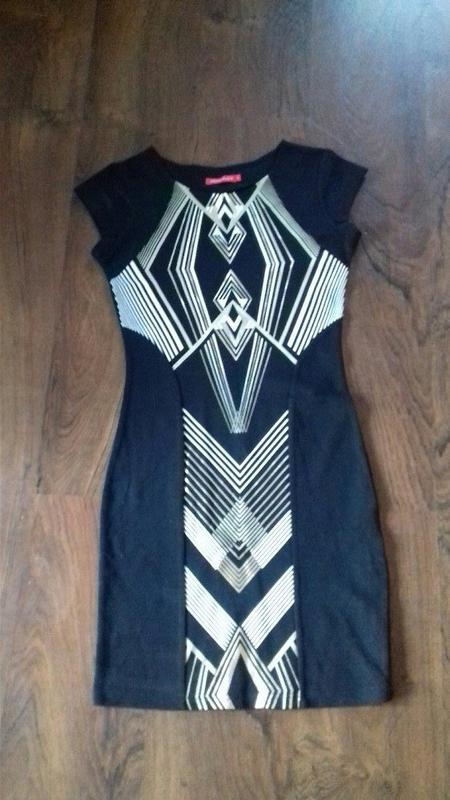 Продам черное трикотажное платье,с золотистым рисунком.Размер на наш 46.Не одела ни разу.Длина до колена.В облипку.Ширина груди-40см.Талия-32см.Ширина низа 38см.Длина 84см.