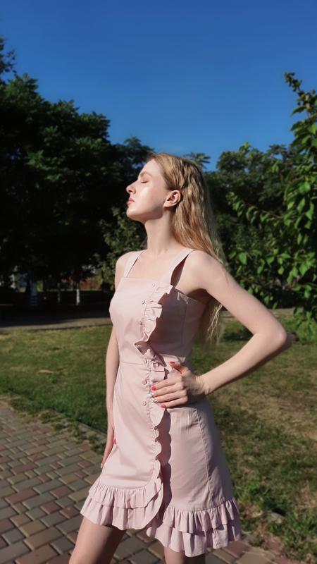 Розовое платье, изготовленное из 100% хлопка и украшенное рюшами, выглядит очень нежно