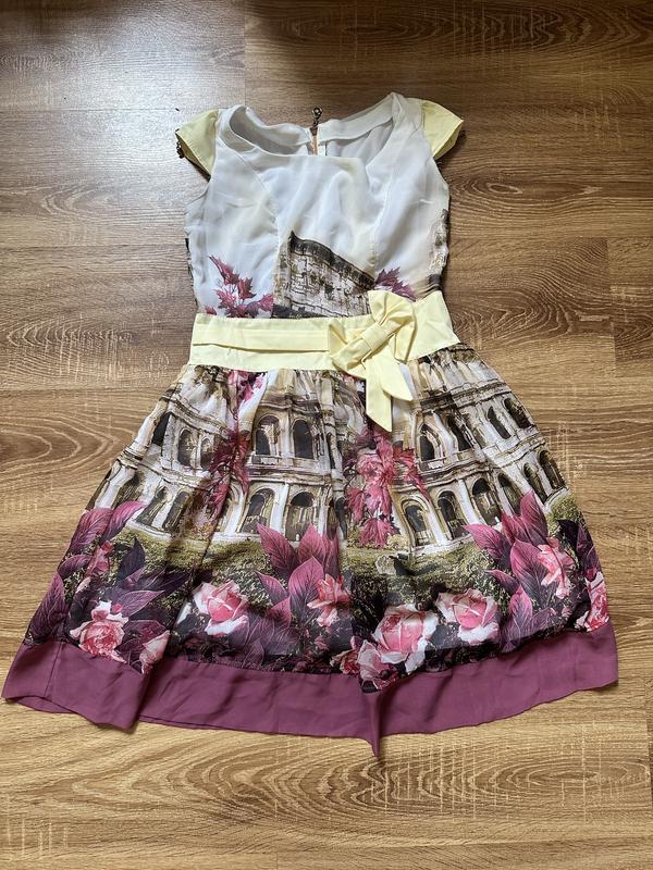 Платье имеет приятные цвета, очень легкой ткани, с желтым поясом на талии который красиво подчеркивает талию