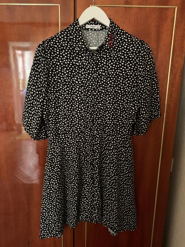 Продам черное платье в сердечки с надписью на воротнике Застегивается с переда на пуговицы Перчатка удлиненный Приятный и легкий материал Платье на рост до 165см Размер указан л но отлично подойдет и на м/с