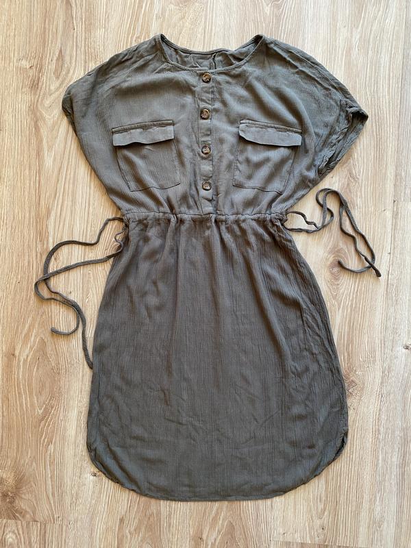Легкое платье цвета хаки с карманами и пояском. Размер М