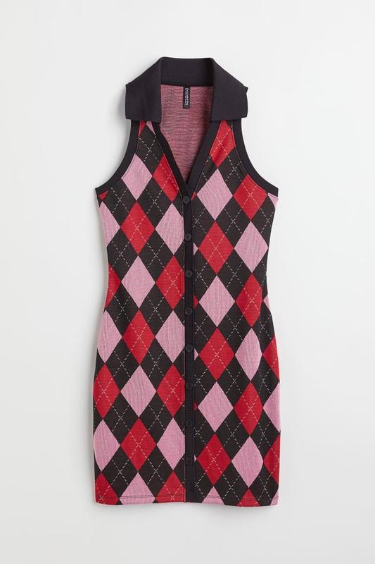 Размер L Короткое приталенное платье из жаккардового трикотажа. Без рукавов, с узким вырезом сверху, воротником и пуговицами спереди.