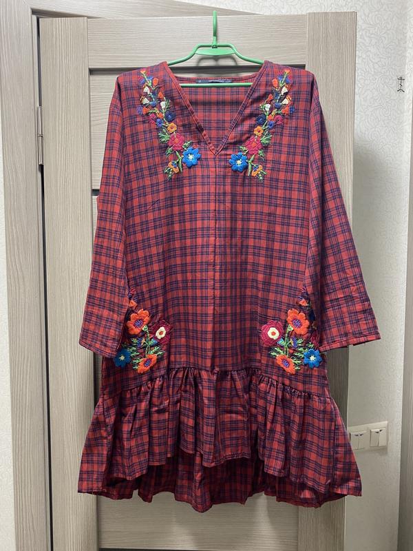 Платье красное в клетку с вышивкой. Нове. Размер М, но подойдет на Л Оверсайз