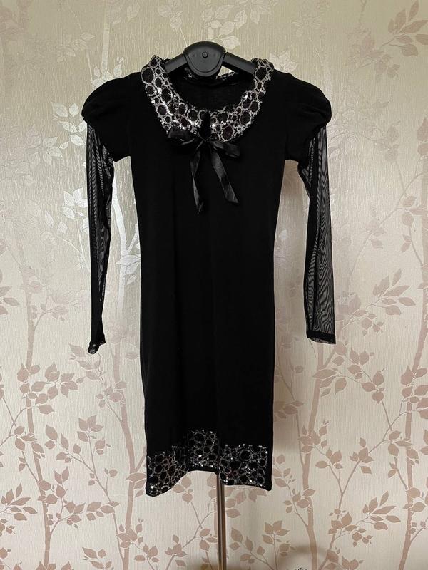 Платье нарядное, удобное, спереди с блестками, сзади обычное черное Воротничок с блестками Рукава сеточки Удобное и если зимой надевать, то не холодно