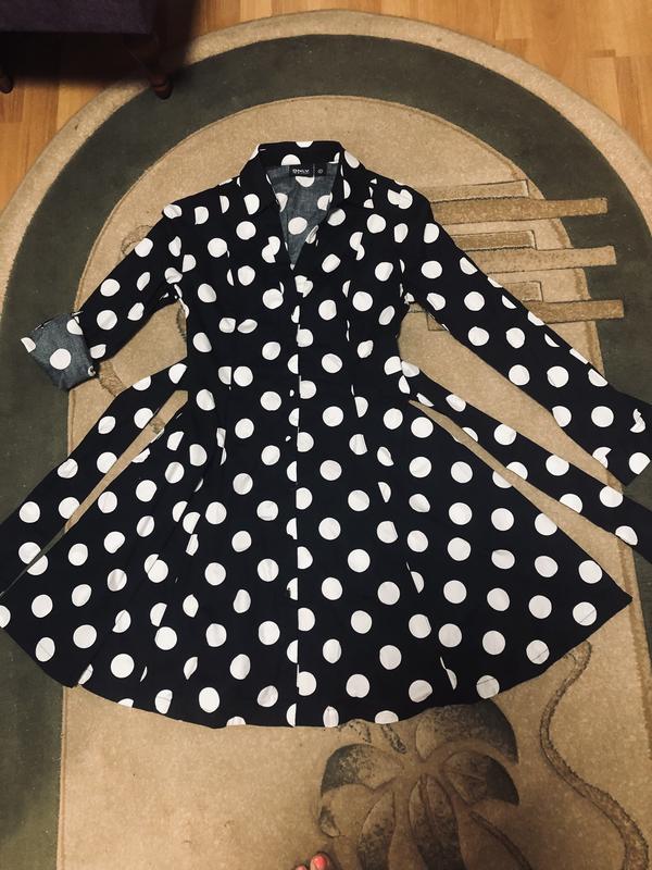 Черное с белым горохом платье рубашка на пуговицах с вшитым поясом, рукава на манжетах могут подгибаться и застегиваться на пуговицу. Длина 84 см, объем груди 82 см.