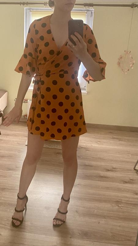 Платье на запах с завязками в горошек с красивым рукавчиком, коротенькое (на фото 1.70, лучше будет на меньших девушек 1.60...). Состояние новой, не носилась.