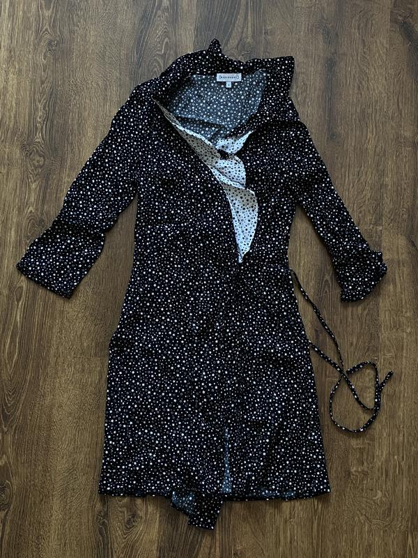 Платье Warehouse в красивый звездный принт, состав вискоза, приятный к телу, размер s-m, сидит идеально, мой рост и параметры 169см 86-68-94, короткий, глубокий V вырез, на запах, милые рюши на декольте и по низу, рукавчик 3/4 на пуговице