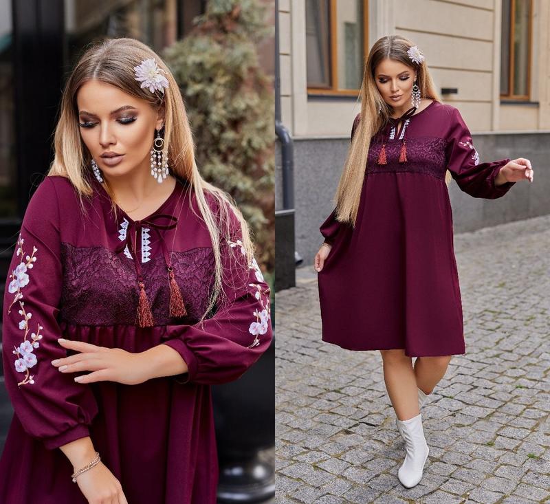 Сукня Платье свободного кроя с декоративными шнурками, вставкой из качественного гипюра и цветочной аппликацией на рукавах ▪️Ткань: костюмка армани, гипюр ▪️Размер: 48-50, 52-54, 56-58, 60-62 ▪️Цвета: марсала, черный, индиго