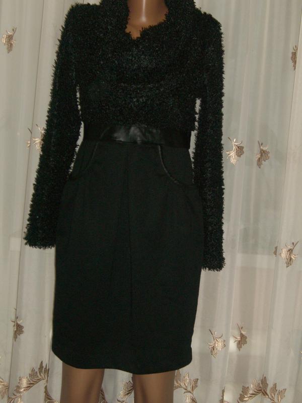 платье черного цвета, на подкладе, выполнено из комбинированных тканей: верх мохнатый, низ плотный трикотаж, пояс и отделка карманов из кожзама, ворот-хомут, длинный рукав, по бокам карманы, застегивается на молнию сбоку, длина до колен