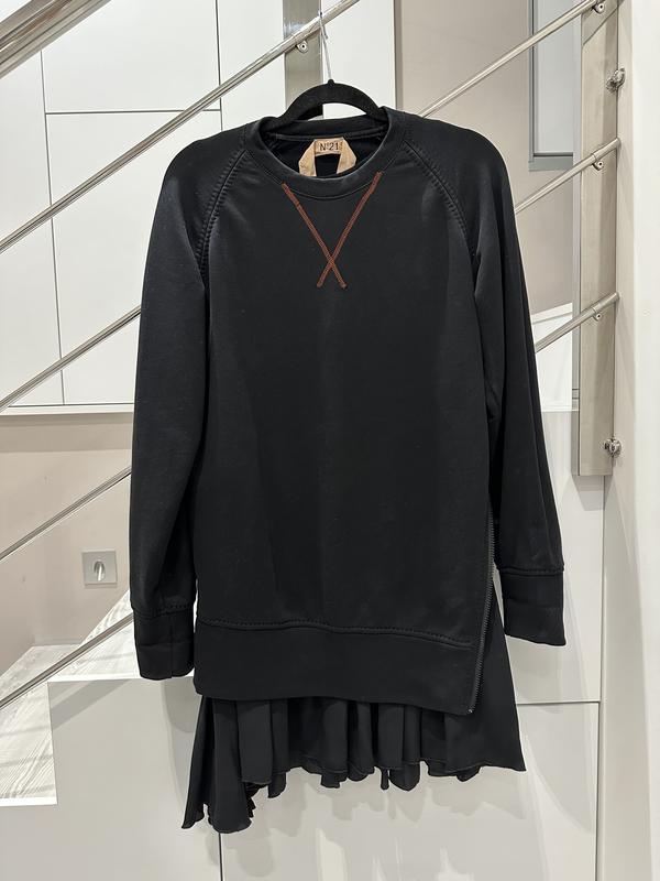 Комплект состоит из двух вещей. Нижний слой это сарафан с асимметричной юбкой и верхний слой это удлиненный свитшот с асимметричной змейкой сбоку. Очень стильный. Размер S-M. Оригинал.