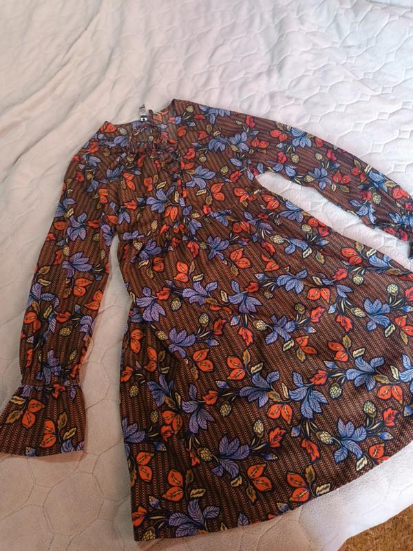 Платье в принт с завышенной талией, красивыми перчатками и шнуровкой на груди. На рукаве резинка. Стан - идеальный. замеры: длина 86 между приемами 99 бежевое свободное