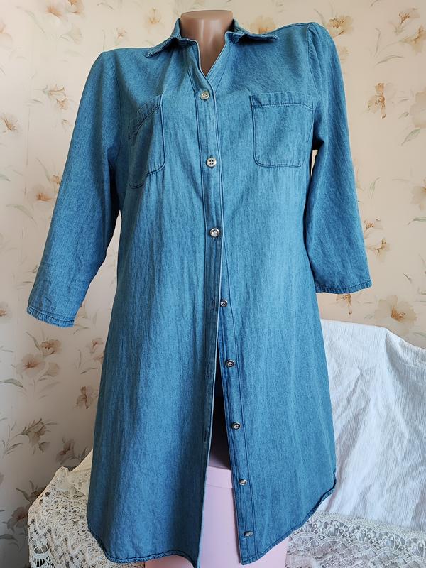 Брендовая рубашка-платье голубого цвета. Деним. ПОГ-ПОТ-ПОБ 50-50-54 см. Спереди на пуговицах. Воротник рубашечного типа. Рукав 3/4, укорачивается на пуговичку. В плечах 40 см. Длина рукава от плеча 40/28 см. Прямая, по бокам заокругленные разрезы. Два нагрудных небольших кармана. Длина по спинке 90 см. Состояние идеальное. Цвет,как на последних фото.