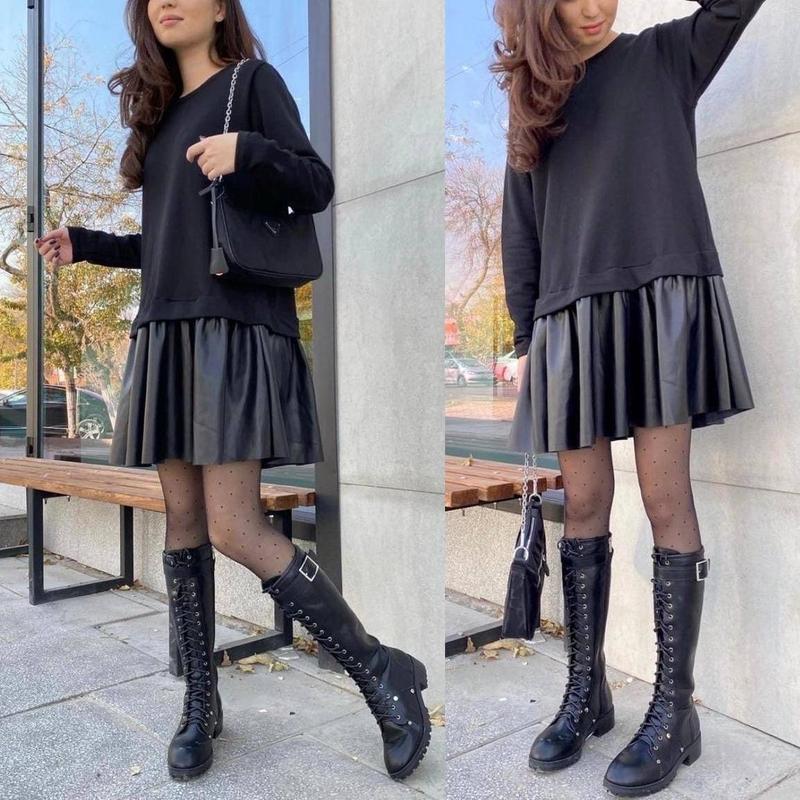 Это платье это комфорт, стиль, и любовь с первого взгляда💓💓💓 Стильное платье⭐️⭐️⭐️ #382 Размеры 42-46,48-52,54-58 Цвет черный однотон низ кожум, синий жаккард низ кожузам👌 Ткань: плотный трикотаж, хорошо тянется и очень комфортная Идет оверсайс, хорошо скрывает животик, также подойдет и для беременных🥰 на модели размер 42-46 Параметри 100 83 102 см Заміри на #382 ✅ 42-46 ОГ 110см От 114см, бедра оверсайс, длина 91 см ✅48-52 ОГ 120см От 122 см, бедра оверсайс, длина 93 см ✅54-58 ОГ 130 см От 135 см, бежевое оверсайс, длина 95 см