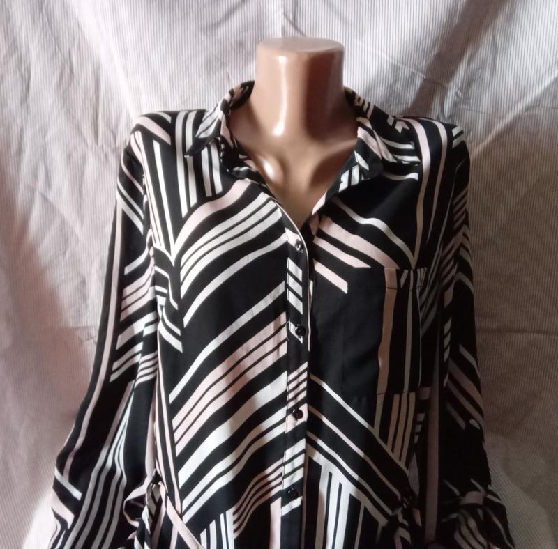 Сучасна,стильна.Має кишеню,фіксатор рукава та вузький пасок. По боках-розрізи. ФОТО НА ТІЛІ НЕМАЄ. Довжина 67 Завширш(пахви) 52 Річ нова,без паперової бірки -СТОК.