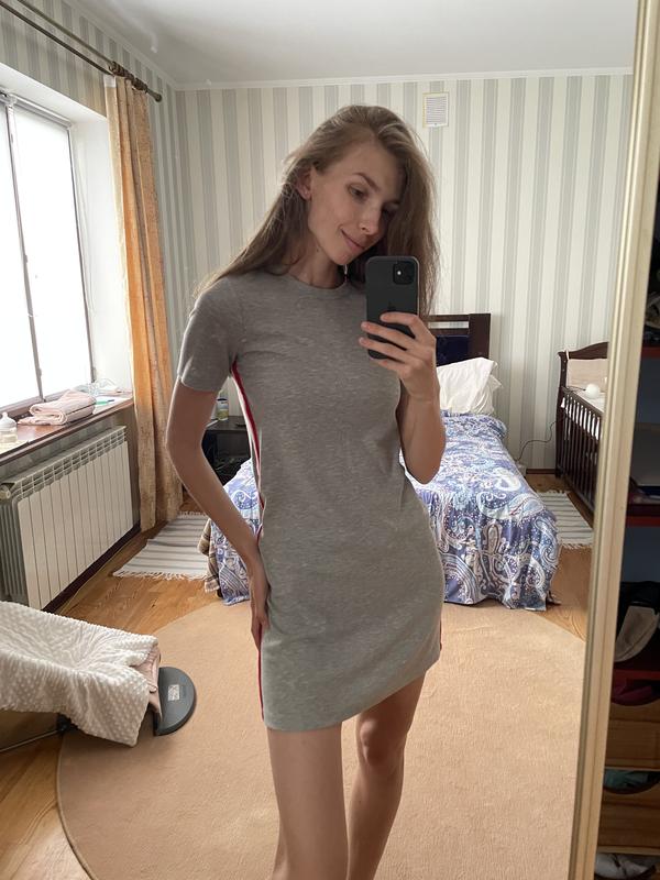 Платье спортивного фасона, в рубчик, по бокам имеет ленты красную и белую. Очень легкое и удобное.