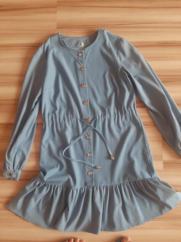 Платье голубого цвета под джинс.Недолик на одном рукаве, он не заметен. Размер s- m