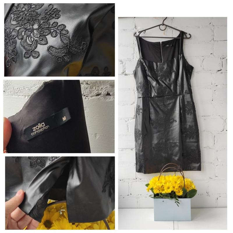 Чорна сукня-футляр из еко шкіри. Тканина на трикотажній основі, трохи тягнеться. По всій сукні, мереживні візерунки. Абсолютно нова але без бірки. Розмір М, на рост бажано від 165-170. Заміри на останньому фото. Всі питання в ОП. Відправк НП, укрпочта.