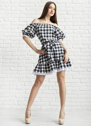 Летнее легкое платье из хлопка Украшено белым хлопковым кружевом Актуальная клетка Пояс в комплекте